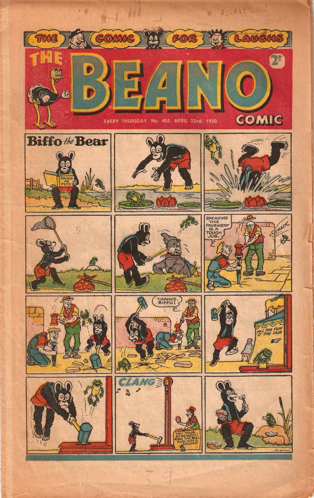 The cover star is Biffo the Bear, who took over from Big Eggo two years earlier, and was to last there for several decades, before Dennis the Menace took over in 1974! Big Eggo can still be seen on the cover though, up on the left hand side of the logo! In this issue the nation's favourite bear wants to capture a frog to keep as a pet, and ends up winning a coconut! As always it was drawn By Dudley Watkins, who signed his work as D.D.W. (his middle name was Dexter). He was one of the few artists to be able to sign his work, but now of course they all can! Dudley didn't always sign his Biffo stories as D.D.W though, in Biffo's first ever cover story (on issue #327) he signed it simply as 'Dudley Watkins'.
